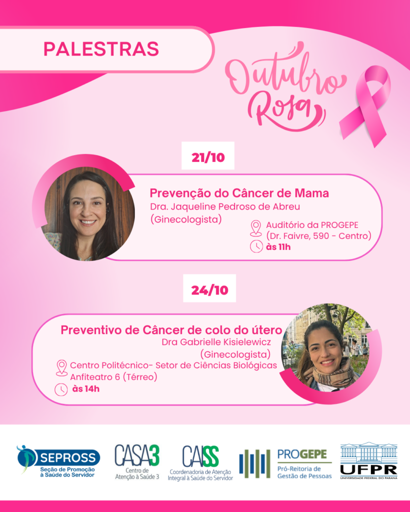 Já na sexta-feira, dia 24/10 a fala da Dra. Gabrielle – também ginecologista do CASA 3, vai trazer orientações preventivas sobre o câncer de colo de útero. E para podermos facilitar o acesso aos servidores que não trabalham na região central, levaremos esta palestra para o Centro Politécnico, no Setor de Ciências Biológicas.