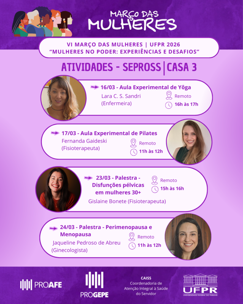 A Pró – Reitoria de Gestão de Pessoas (PROGEPE), por meio da Coordenadoria de Atenção Integral à Saúde do Servidor/Seção de Promoção à Saúde do Servidor (SEPROSS) e do CASA 3, juntamente, com a Coordenadoria de Desenvolvimento de Pessoas, participará da programação do evento Março das Mulheres, da Universidade Federal do Paraná (UFPR).